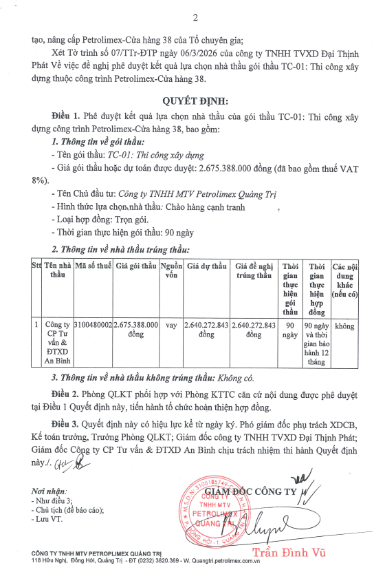 Phê duyệt kết quả lựa chọn nhà thầu gói thầu TC-01: Thi công xây dựng công trình Petrolimex - Cửa hàng 38